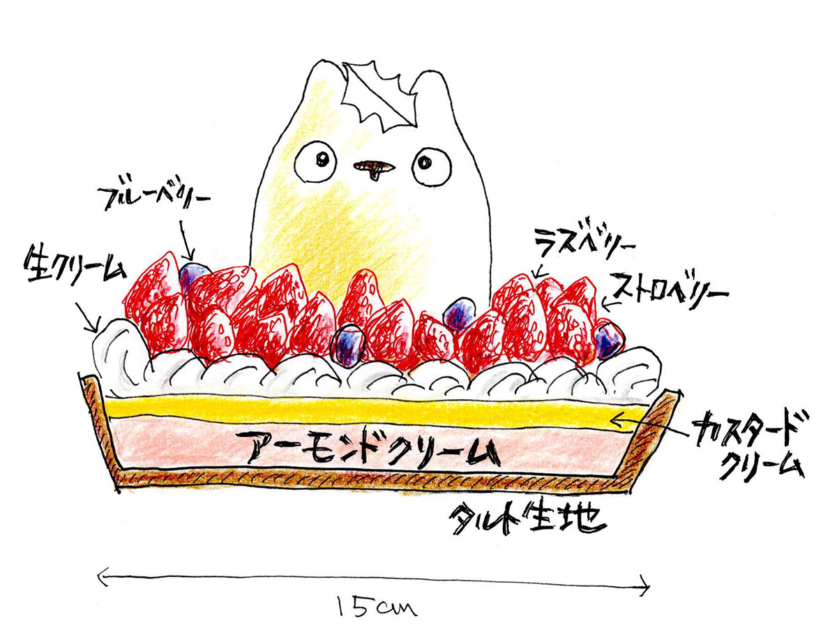 香ばしく焼き上げたタルト生地とアーモンドクリームに、自家製カスタードクリームを重ね、やさしいコクを加えました。
