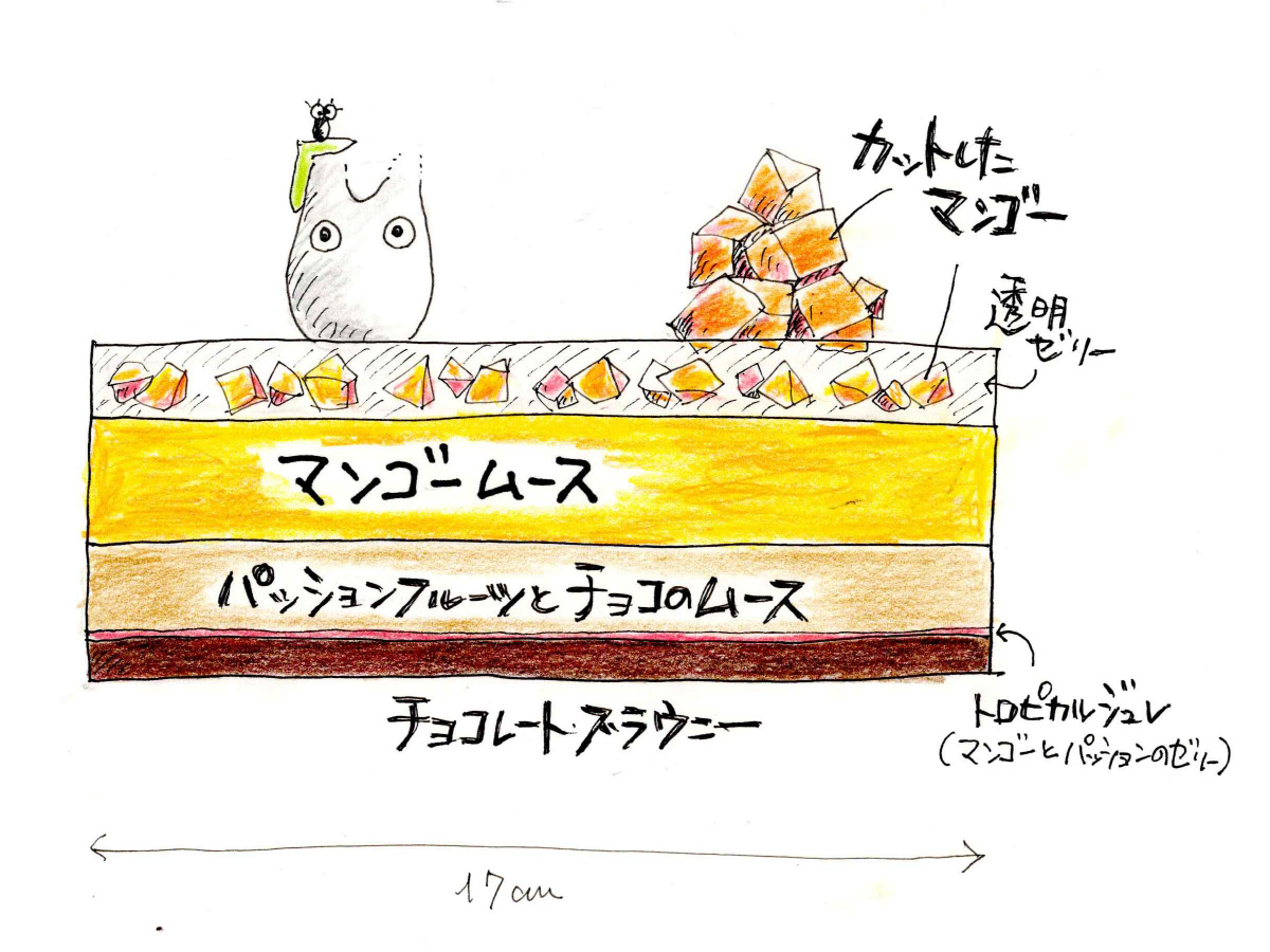 トロピカルな味わいののジュレ、クーベルチュールを使用したブラウニー生地を組み合わせ、爽やかさと濃厚さを引き立てました。