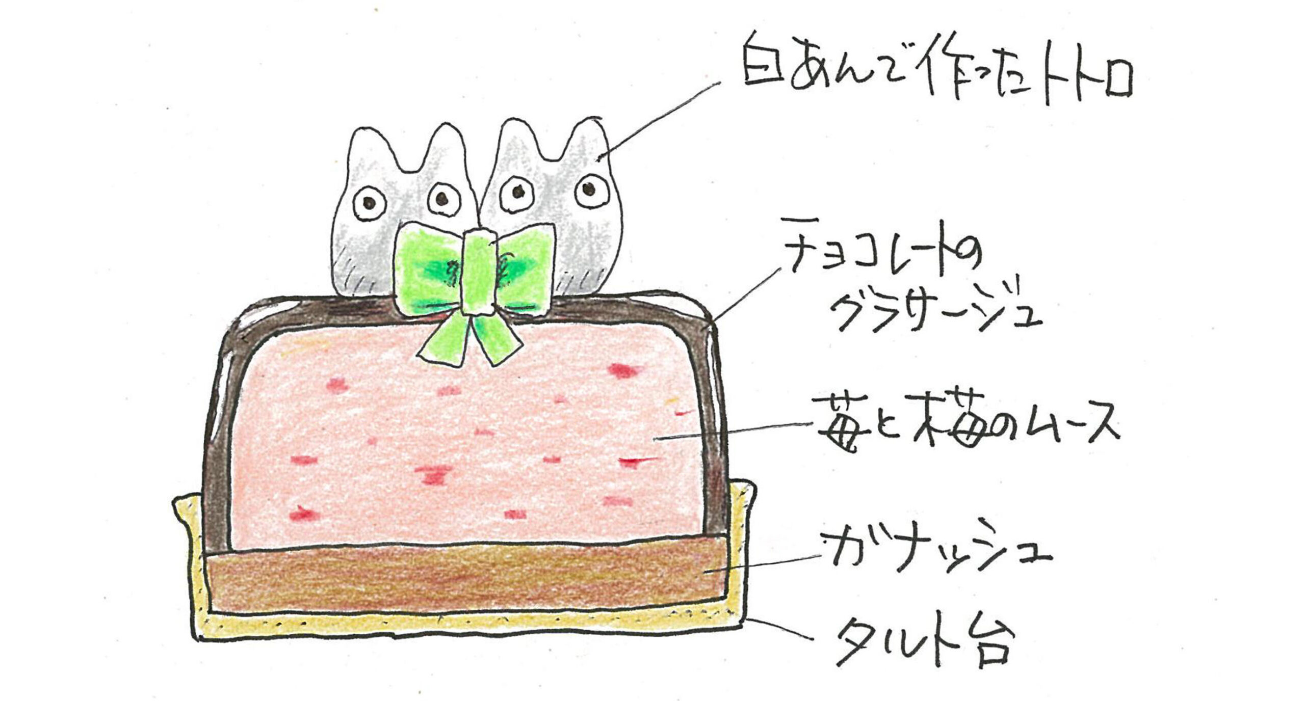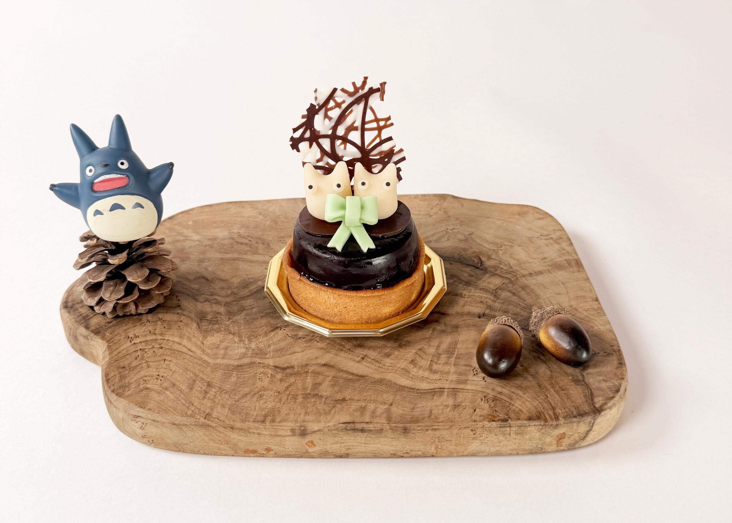 つややかなチョコレートに包まれたタルトの上で、 白あんで作った小トトロたちが